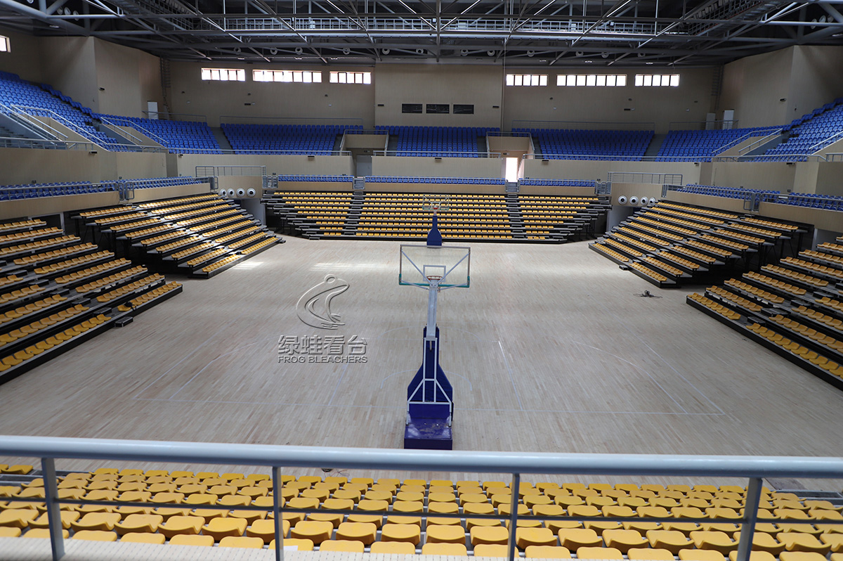 場(chǎng)館中的看臺(tái)設(shè)施由廣州綠蛙體育設(shè)施有限公司承辦搭建安裝,選擇電動(dòng)伸縮看臺(tái)與固定看臺(tái)組合布置,最大程度的利用場(chǎng)館面積,能容納更多的觀眾參與使用,高質(zhì)量的看臺(tái)設(shè)施也保障了觀眾的使用安全及舒適體驗(yàn),醒目鮮艷的座椅配色使得場(chǎng)館充滿運(yùn)動(dòng)的活力。