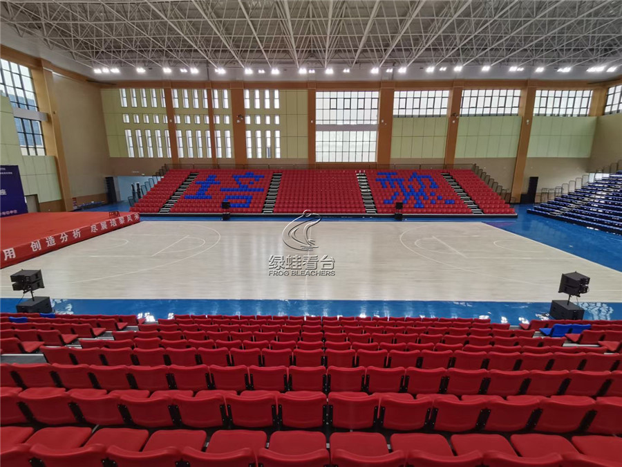 本次健身中心體育館看臺座椅安裝項目綠蛙看臺承建,使用了四種不同的看臺座椅類型、電動伸縮看臺(前置式吹塑翻版椅、靠背注塑椅)、主席臺-可移動伸縮看臺軟包座椅、簡易看臺(平靠背注塑椅),共總3017個座位,座椅設備采用鋼焊接組裝連接,所有安裝用鐵件均靜電噴涂處理。