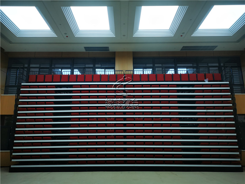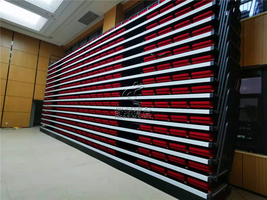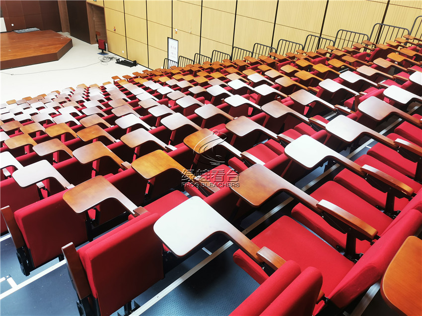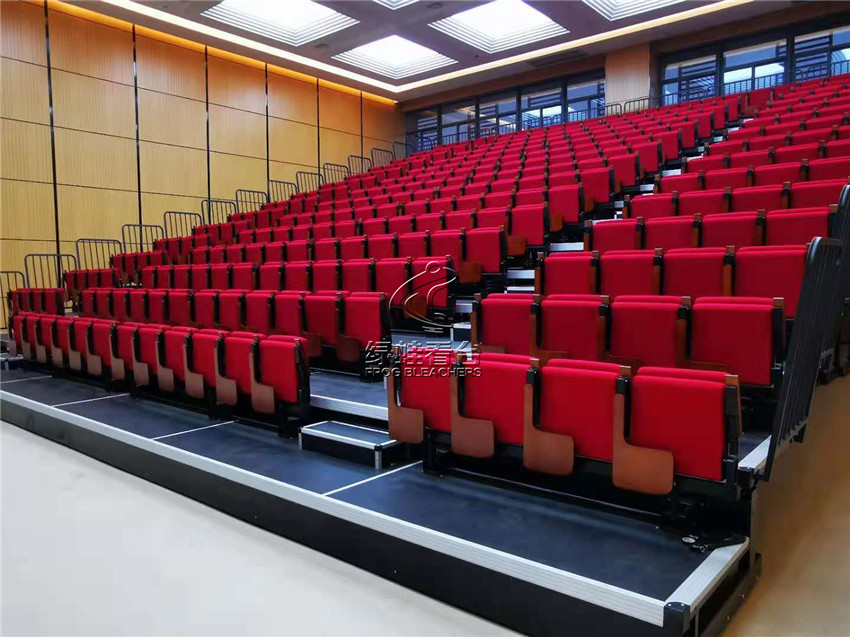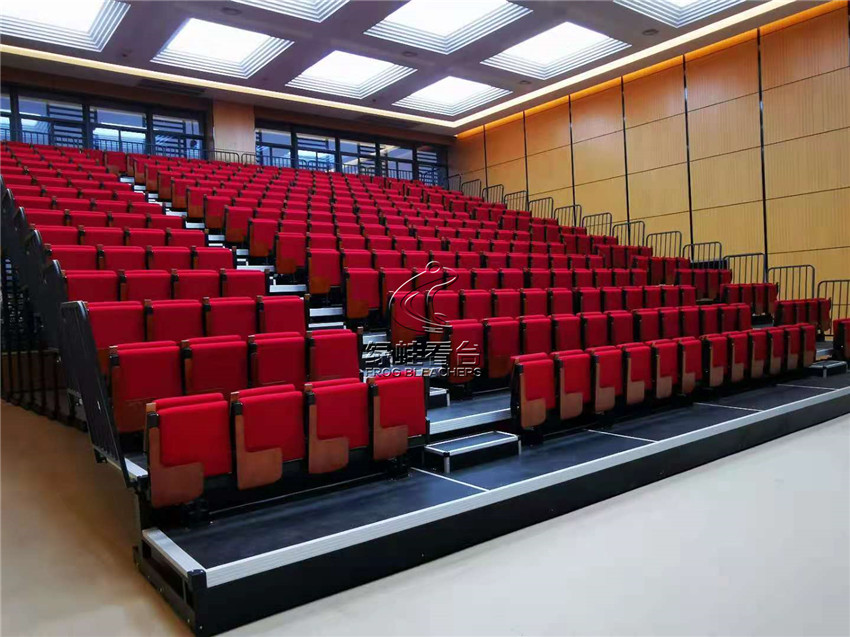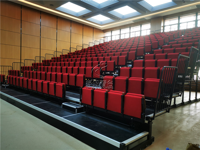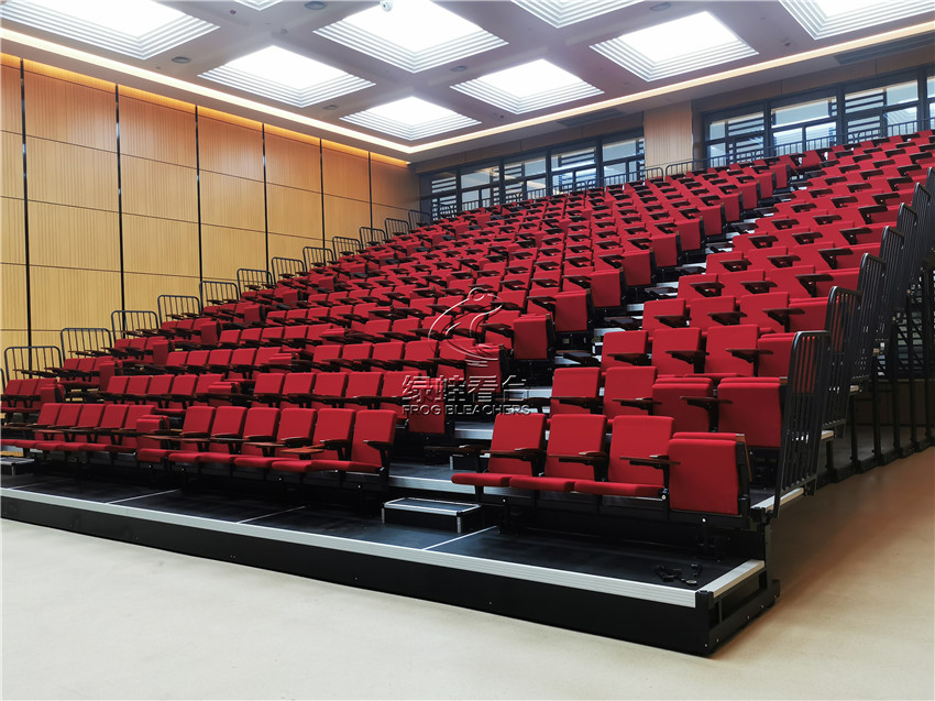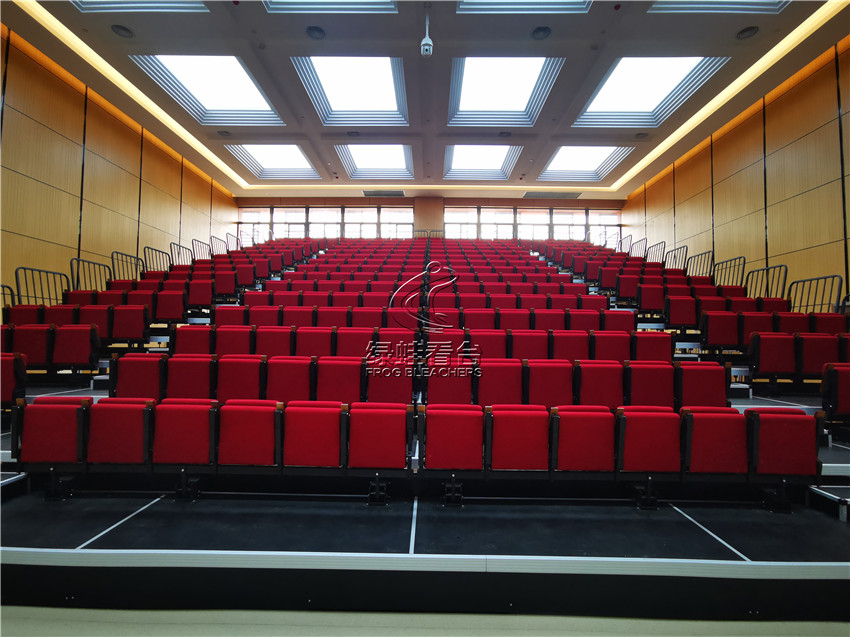 綠蛙看臺承接了福建省疾病預防控制中心會議室的看臺搭建調試項目,選用了電動式伸縮看臺,后置式折疊翻板軟包座椅共304位,步道28級。看臺座椅采用包棉沙發椅,帶扶手帶寫字板,后置式安裝方式,帶寫字板的座位設計,方便參與會議時做記錄,收起之后不占用過多的空間位置
