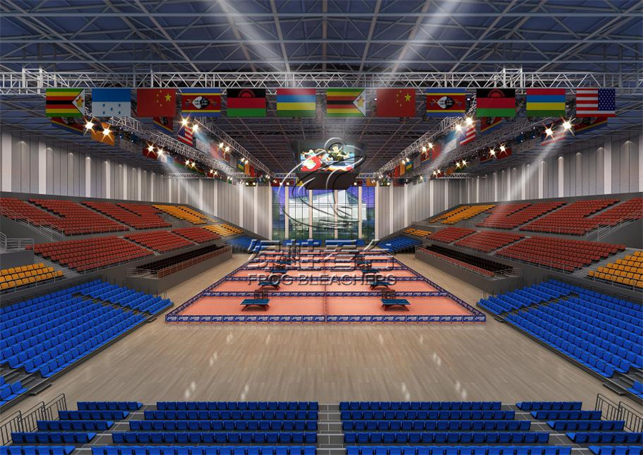 一層的活動伸縮看臺采用的是電動前置式翻板吹塑座椅,采用靜電噴涂處理,層寬850mm,尾層寬500。首層高330mm,錯層高300mm,活動看臺踏板材料選用17mm防火防滑舞臺板。