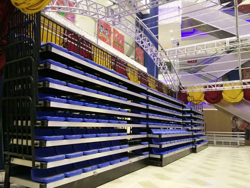 在與綠娃公司進行多輪溝通后,客戶方對綠蛙提供的方案非常滿意,兩側采用可移動簡易鋁制看臺,正對舞臺采用9層可移動式伸縮看臺。既滿足了客戶300人的座位需求,又實現了整體可移動的功能,堪稱完美。