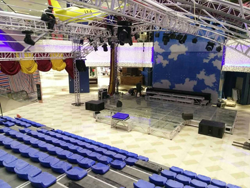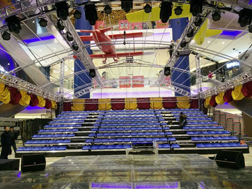 湘潭天虹百貨商場,搭建了一個小型舞臺,有桁架、燈光、音響、舞臺、看臺。客戶的需求是整體做成可拆卸可移動的。