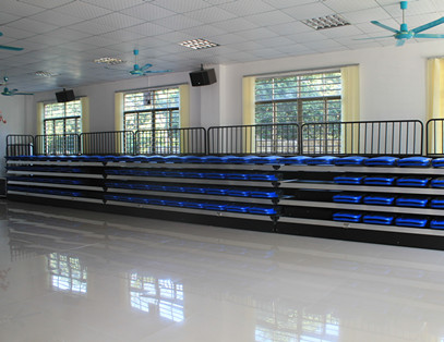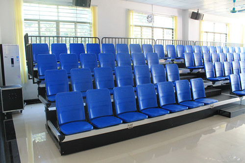該看臺為手動可移動式伸縮看臺,看臺總共4層,座椅采用高靠背翻版折疊椅??磁_不使用時可以折疊靠墻,也可以推走。