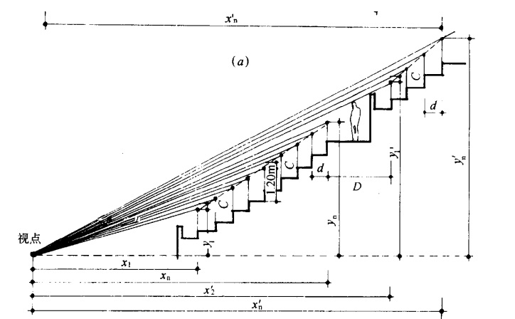 從使用方便和安全考慮 ,每臺階高度與臺階深之比不宜大于 1 : 1. 5,其實際尺寸高不宜大于60cm,最小高度不宜小于25cm,上下臺階高度差值宜以lcm為單位,以便施工。看臺視線設 計考慮到計算假設條件失真,如人體標準身高1.7m,座高 1.3m等以及運動項目和觀看地面面積大小不同等因素,在實際使用時觀眾能自行調整角度和方位。因而只要掌握好設計基本原則就能收到較好的效果 。因此計算方法不宜過于精確 ,而給建筑施工增加不必要的難度。