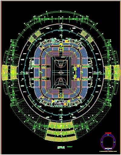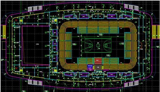 1)長方形平面:長方形平面的優點是外形簡潔、結構簡單,場地縱向兩側看臺視 線好、容量大、基本能按最佳視線位置安排座席,適用于看臺邊線為長方形,場地縱軸兩側或一側為主看臺的中小型館。