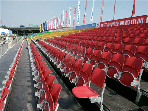 該賽場的看臺選用我司的可拆卸拼裝臨時租賃看臺,其設計為12層,可容納2000人的觀眾,看臺首層起高1.2米,視野開闊,精彩節目一覽無余。看臺層與層之間鋼板封閉,觀眾站在看臺上完全見不到地面,從而沒有任何站在高處的恐懼感。