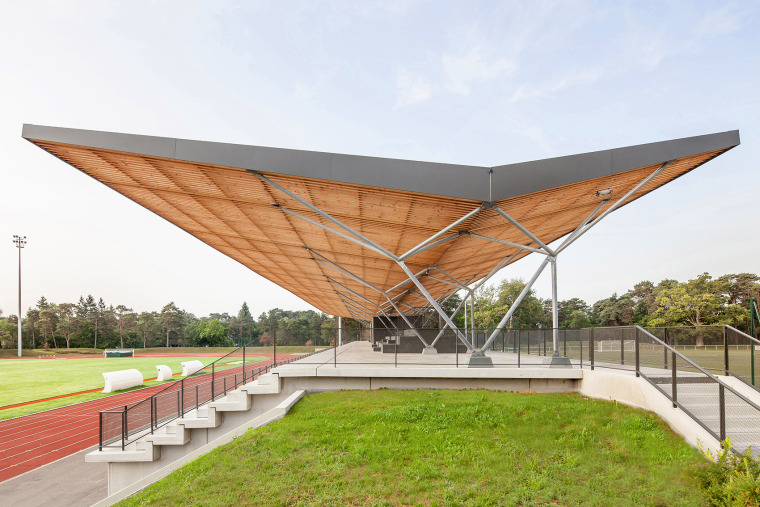 天棚覆蓋整個平臺和座位區。折線屋頂呈向谷地匯合的姿態,中間有一條長的溝槽。以17米為間距分布的樹狀立柱組成了屋頂的支撐體系。每個樹狀柱包含3個分柱,與漆面鋼管在高度超過3米處形成雙向鉸接。每套柱子組成一個三角形結構,為屋頂提供6個支撐點,以確保屋頂有足夠的橫向強度。房頂結構采用道格拉斯冷杉木,由兩對分布在不同截面上的粘結梁組成,通過13個桁條實現連接。垂直支撐由中心的矩形體塊提供。上面覆蓋著波紋聚碳酸酯板的表面。遮陽蓬的下表面是由厚實的道格拉斯杉木制成的密網,它能過濾陽光的直射,并通過光線的變化和木材的紋理共同強調屋頂的輪廓。