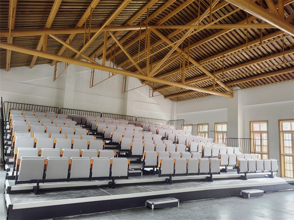 伸縮看臺座椅采用帶扶手全封布軟包座椅,后置式安裝方式,顏色為灰色,配合室內裝修風格。一層裝雙排,同層雙排前后高度錯開。座距520mm,后邊和側邊(第一層除外)加安全防護欄桿,欄桿高度為1100mm。