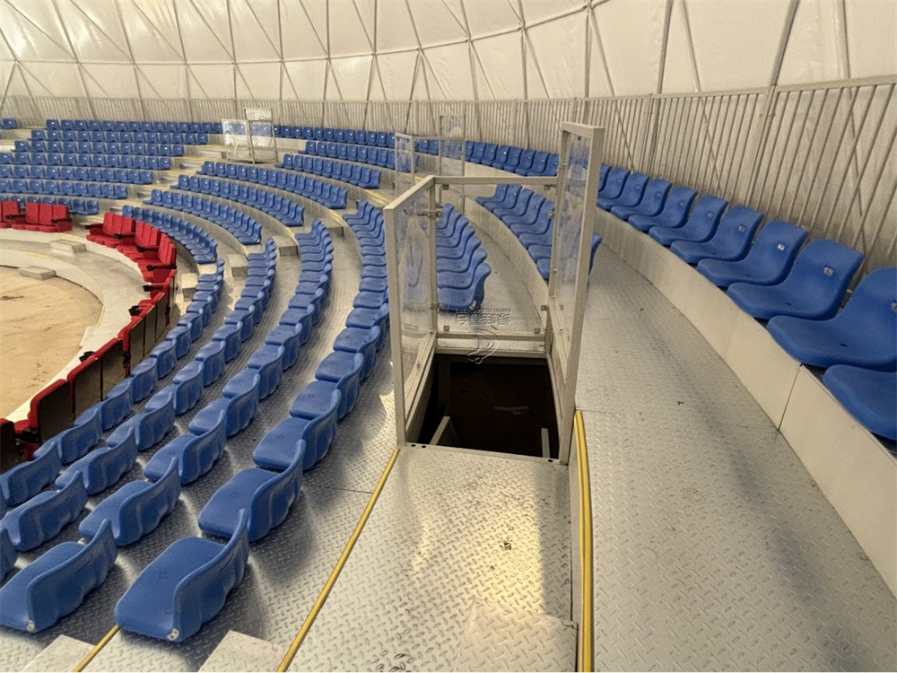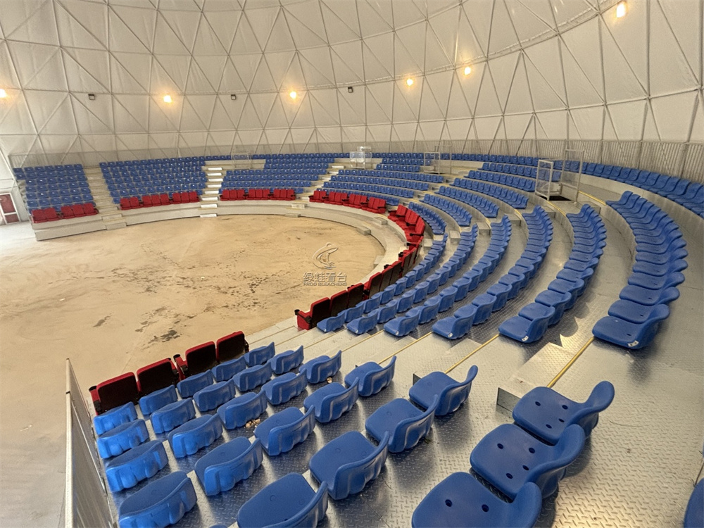 其中看臺由綠蛙看臺傾心打造。看臺整體為環形,與蒙古包渾然一體,也照顧到每個觀眾的視角。看臺基礎采用鋼結構,面板也是防滑紋鍍鋅鋼板。座椅采用中靠背吹塑座椅,坐感舒適。看臺整體可容納500多名觀眾。