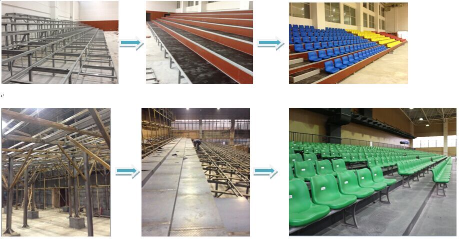 2、該看臺避免了在室內構筑水泥臺階等土建工程的麻煩,具有安裝、拆卸方便的特點; 特別是對于非首層、承載力達不到土建要求、多年后便于拆卸另有他用的的館內使用。