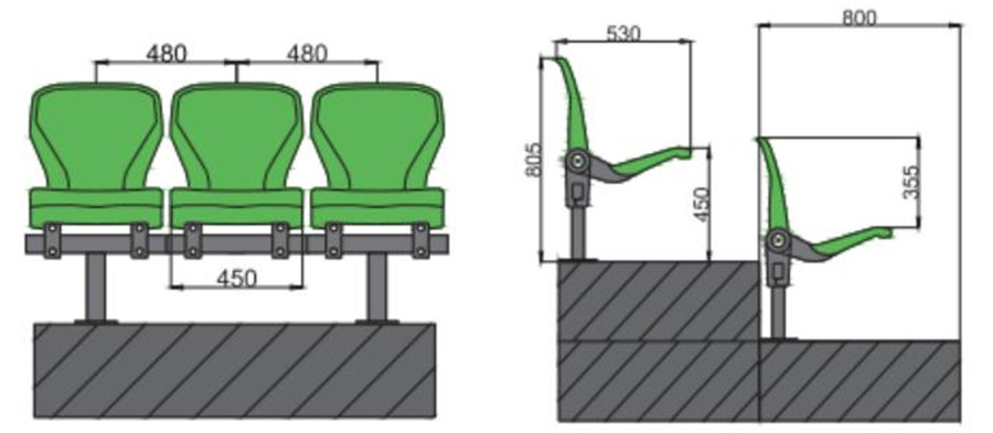 固定看臺座椅(綠蛙牌)可分為側裝、立裝等不同安裝方式的座椅。