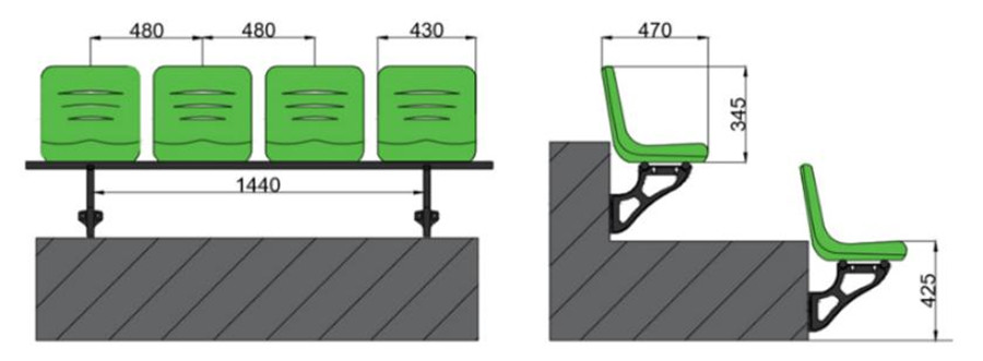 座椅采用側(cè)裝方式的座椅,椅面距地面高度約為420mm左右,座椅支架選用優(yōu)質(zhì)壓鑄鋁支架連接鍍鋅圓管。壓鑄鋁支架采用靜電噴塑處理。支架采用M10×80的擊芯膨脹螺栓與看臺水泥壁面相連,每個膨脹螺栓可抗力100kg以上。鍍鋅圓管外徑不少于φ32mm,厚度不少于2mm。圓管兩端采用橡膠塞頭封口。緊固件、座椅連接件采用鍍鋅處理。