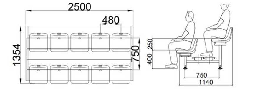 看臺設計為2層,長2500mm,寬1190mm,最后一層座面高650mm。該高度不設計護欄。每組看臺最可坐10人;