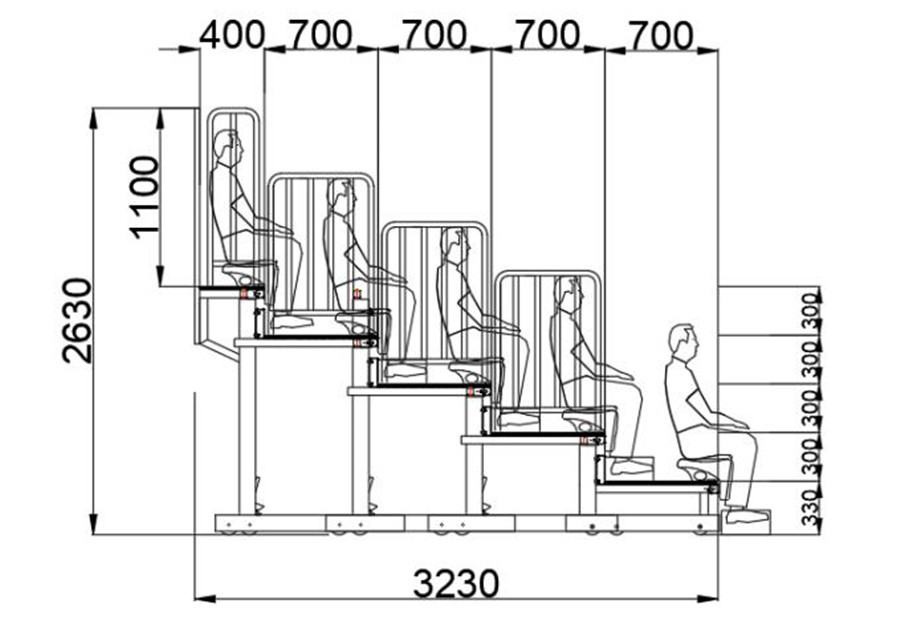 (2)看臺整體為垂直支撐結構??磁_層寬700mm,尾層寬400mm;首層高330mm,其他層高300mm。(伸縮看臺為定制產品,可根據實際場地和客戶需求,略微調整尺寸。)