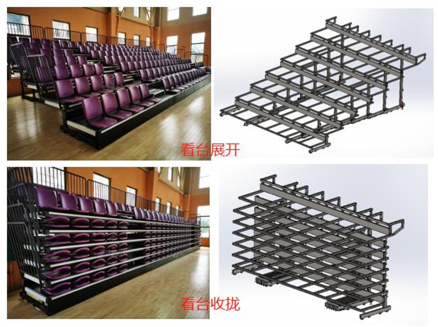 伸縮看臺也稱為活動看臺,活動看臺的稱呼是相對于固定看臺而來,伸縮看臺拉伸成臺階形時,看臺上的座椅供觀眾舒適地欣賞節目,收縮成匣子狀(似抽屜)時則占用很少的空間,讓出場地以安排他用。伸縮看臺可充分利用室內的有限面積,滿足不同功能情況下的多座位要求。伸縮看臺廣泛應用于體育館、會議室、示教室、演播廳、多功能廳等。