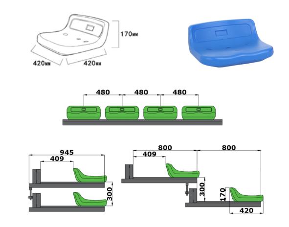 活動(dòng)看臺(tái)座椅采用低靠背中空吹塑座椅,前置式安裝。座椅上有三個(gè)安裝孔,透過座椅安裝孔將座椅直接安裝在看臺(tái)的踏板上,不需要任何金屬連接片。